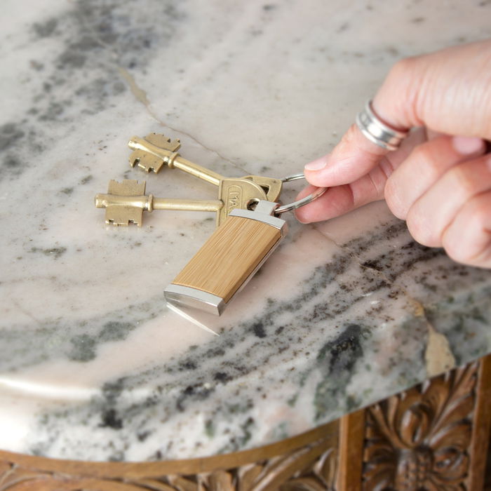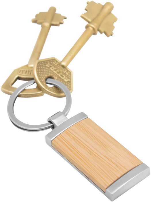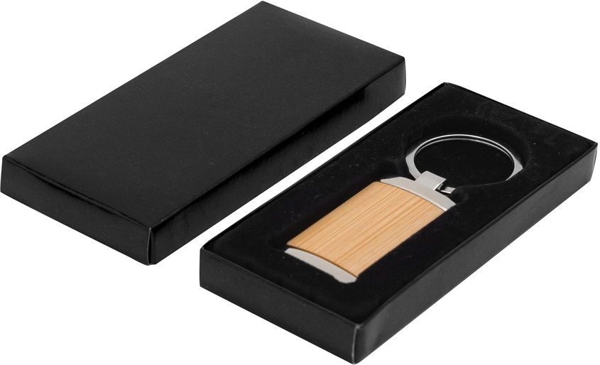 8,5 x 2,4 x 0,6 cm. Llavero rectangular de bambú con detalles metálicos. Presentación en caja de regalo. L,LX