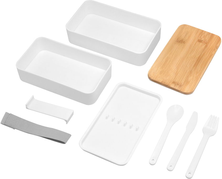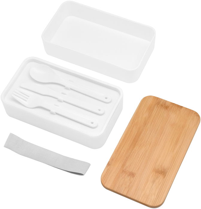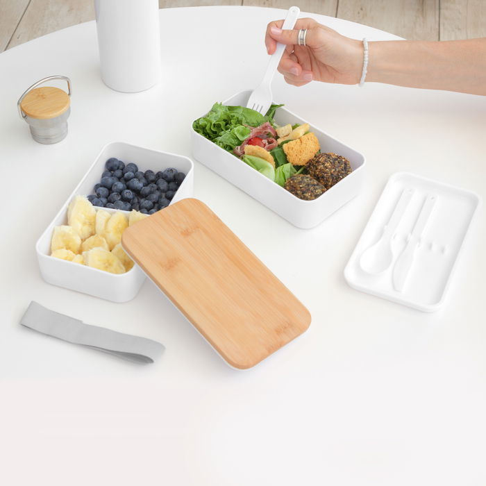 Contenedor de alimentos con tapa de Bambú. Posee dos compartimentos plásticos, un separador y bandeja porta set de 3 cubiertos (cuchillo, tenedor, cuchara). La tapa de bambú debe presionar firmemente la bandeja donde se fija el juego de cubiertos. Cierre con sujeción elástica color gris. Producto apto para microondas (sin la tapa). Importante: solo se puede calentar la comida, NO sirve para cocinarla.