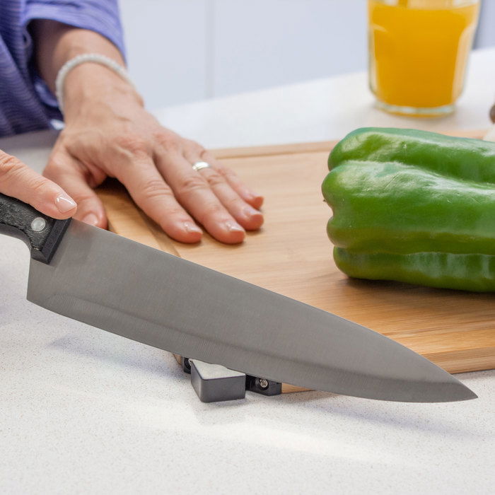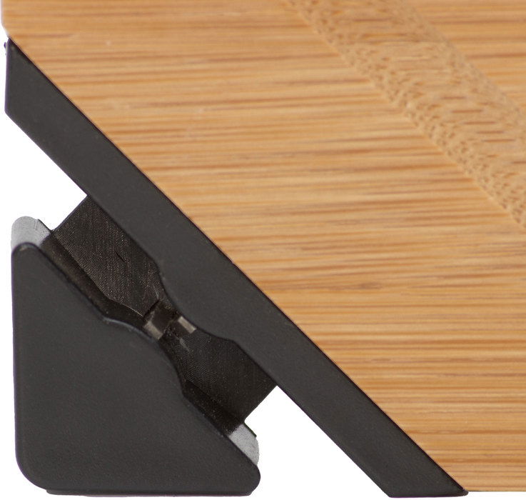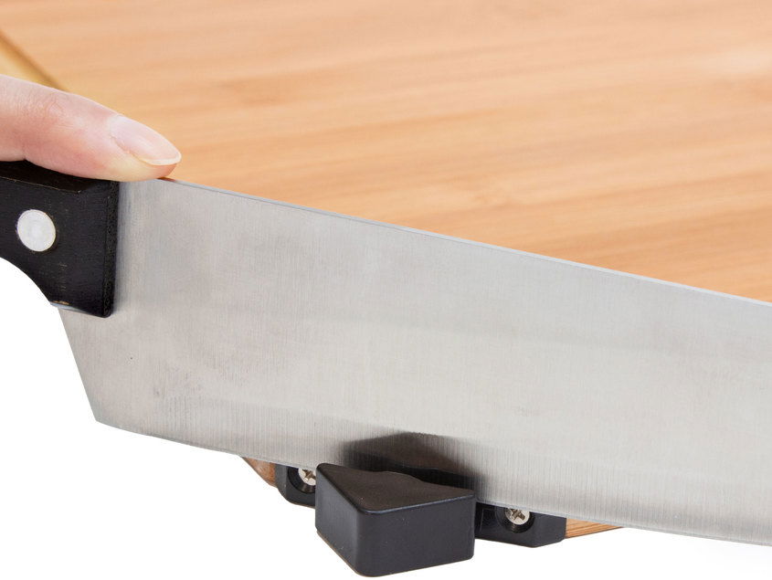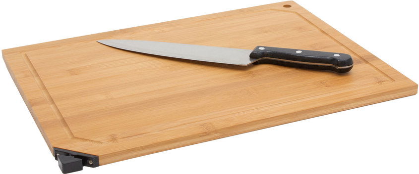 40 x 30 x 1.2 cm. Bambú. Set de corte. Tabla de Bambú con afilador incorporado y cuchillo. Cuchillo de acero inoxidable con mango en madera color negro de 32.5 cm . Afilador de plástico y acero de 5 x 2,4 x 1,2 cm. Presentación en caja de regalo.