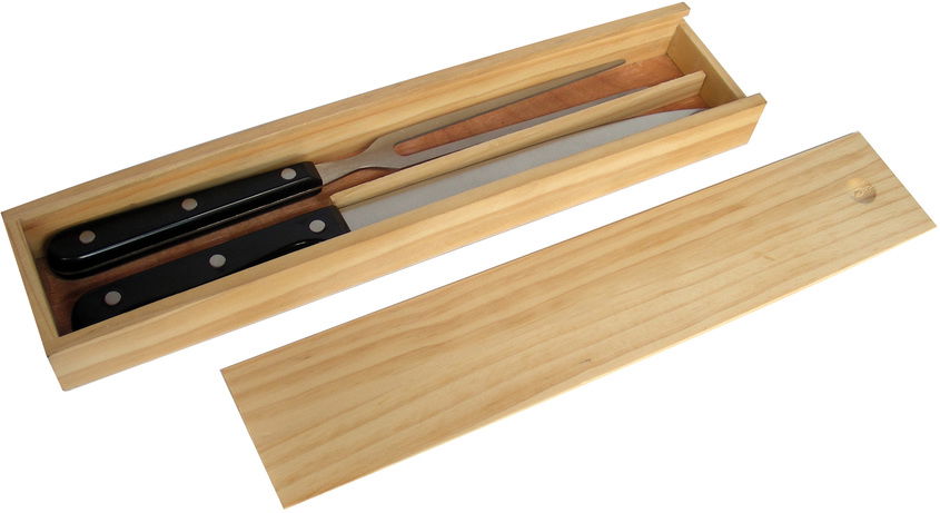 34 x 4,1 x 7,3 cm. Acero inoxidable y polipropileno + Madera. Juego de cuchilla y tenedor en caja de madera. Presentación en caja de regalo.