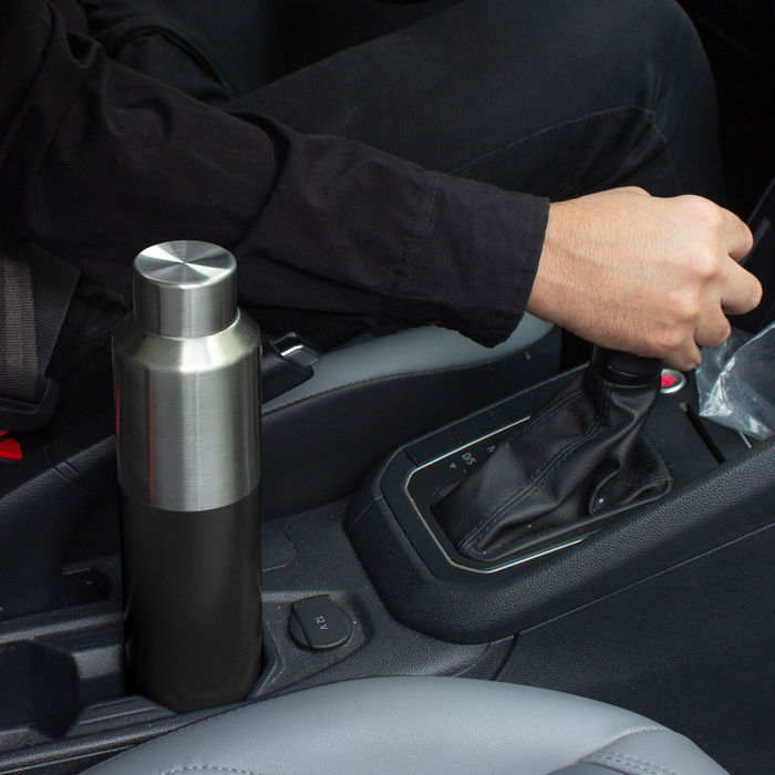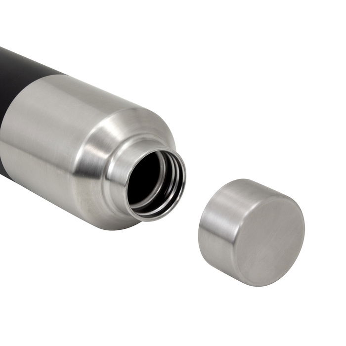 Botella doble pared, sellada al vacío. Interior de acero 304 y exterior de acero 201. Tapa a rosca de acero 201 con anillo de silicona. Pintura acabado mate en parte inferior. Mantiene por más de 12 hs la temperatura de las bebidas calientes y 24 hs de las bebidas frías.