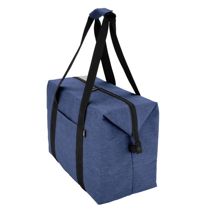 Bolso térmico. Cierre posterior con dos tiradores. Hebillas metálicas en los laterales que permiten cambiar su formato a prisma. Bolsillo frontal. Dos asas con refuerzo de velcro.