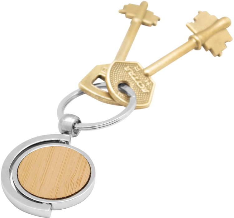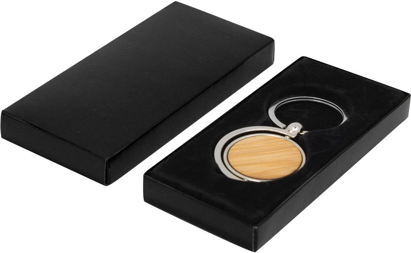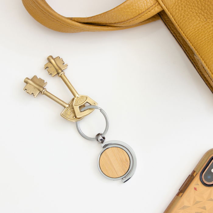 Medidas: 7,5 x 3,5 x 0,4 cm Materiales: Llavero circular de bambú con detalles metálicos